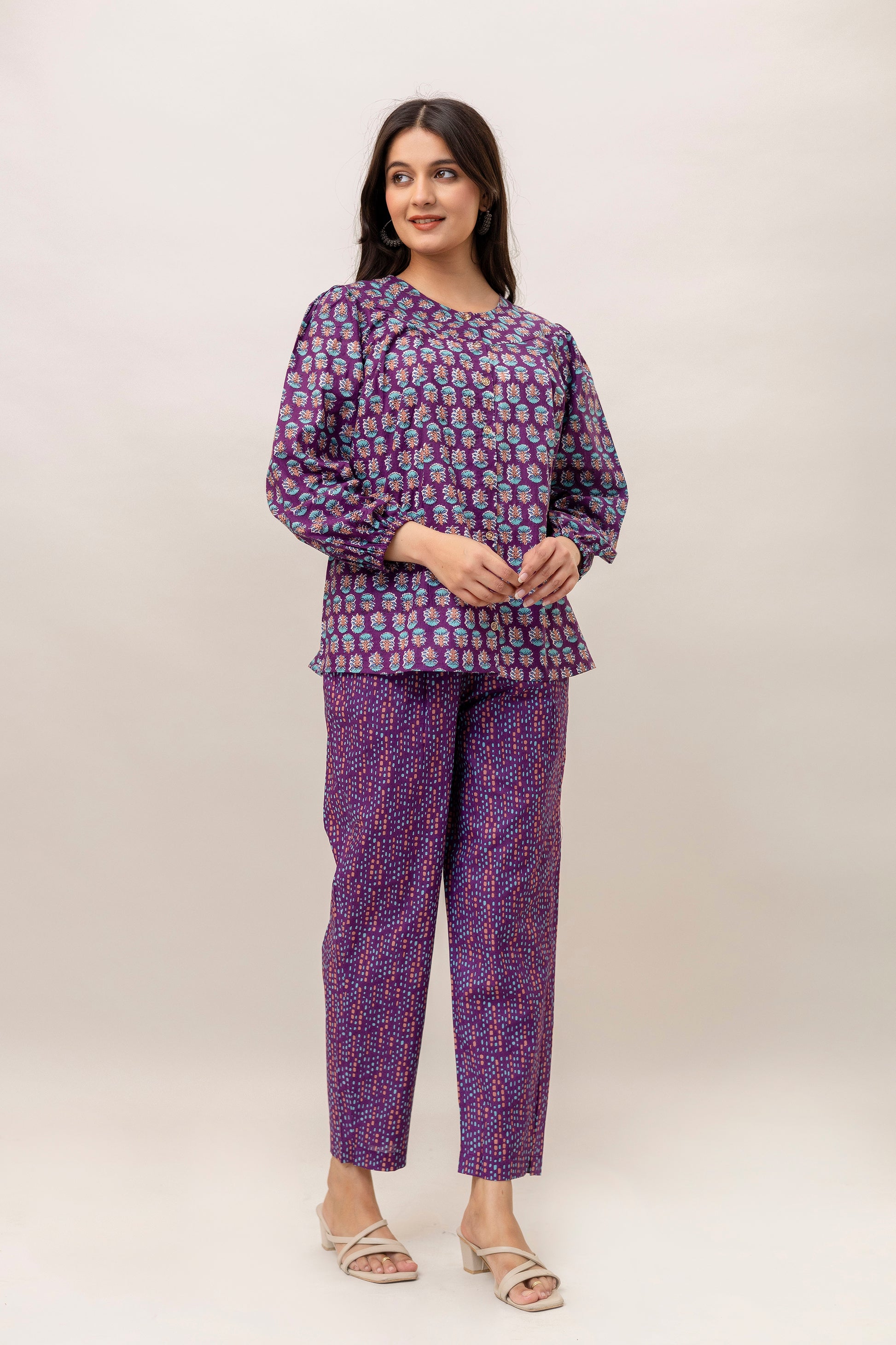Women’s Printed Two-Piece Set – Purple Cotton Top & Pants